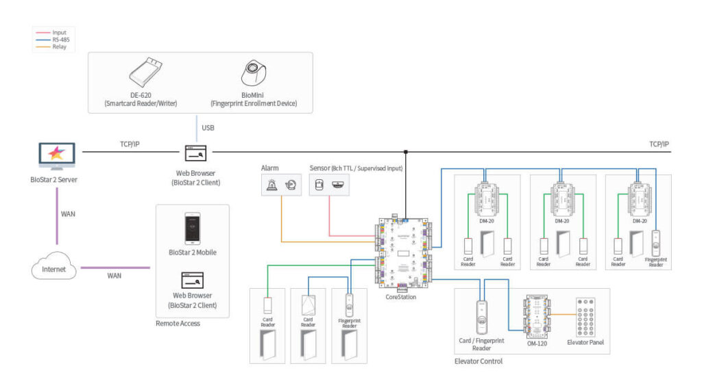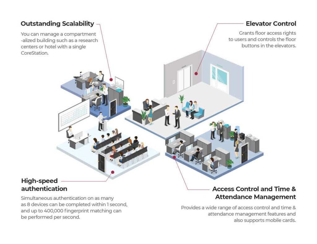 With Suprema's CoreStation and readers, you can build a centralized system. This system would be based on access control units (ACU). Suprema's centralized system not only offers the benefits of biometrics, but it also gives you enhanced security with excellent system scalability. In addition to this, the centralized system enables you to upgrade your existing systems at a much lower installation cost. Integrated with BioStar 2, this system safely stores all information about each user. This includes their name, ID, PIN, access rights and fingerprint data by storing it on a single device. Suprema's intelligent biometric controller, CoreStation, is capable of performing fingerprint matching as well as reading RFID cards. It provides different performance and features based on a 4-channel module that boasts of a superior hardware performance and scalability.